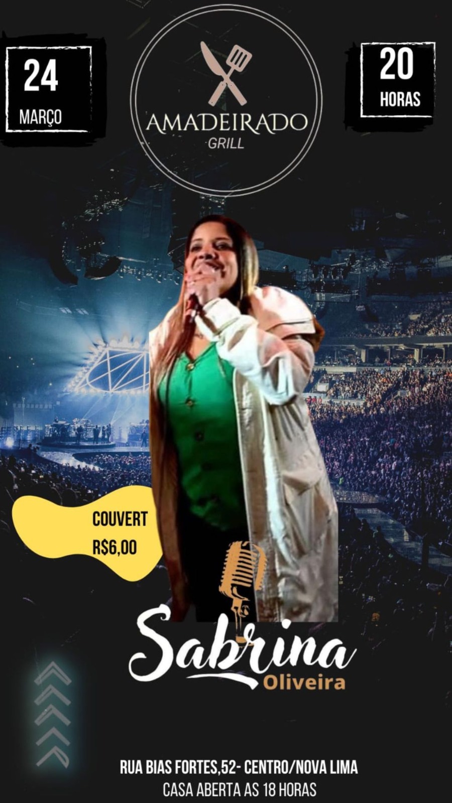 - Amadeirado Grill (20h): Sabrina Oliveira (Rua Bias Fortes, 52 – Centro)