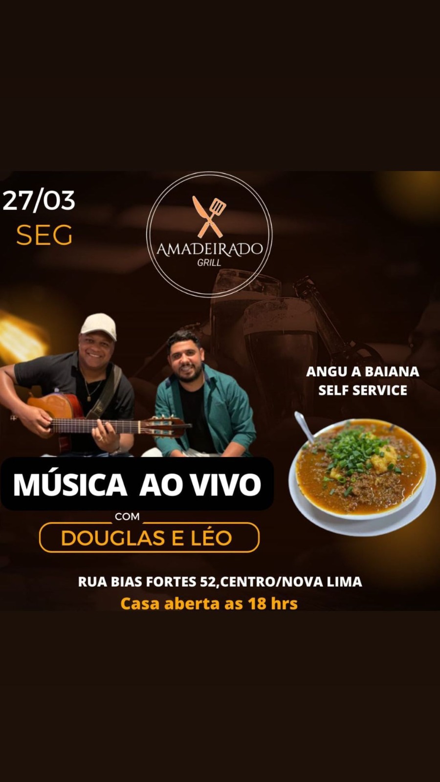 - Angú do Amadeirado (18h) Douglas e Léo (Rua Bias Fortes 52 Centro Nova Lima)