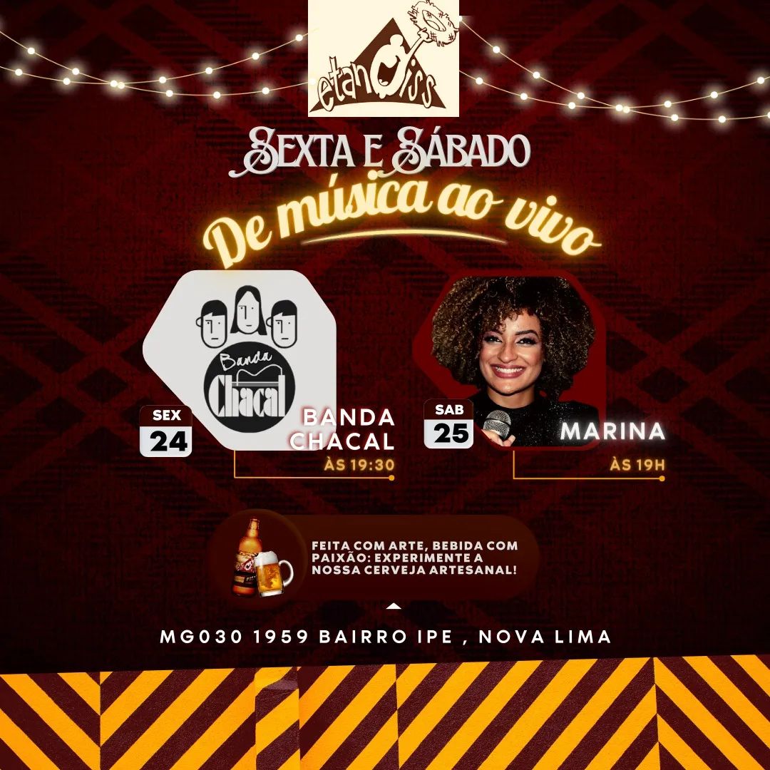 - Etanois (19h): Marina – Pop Rock/MPB (MG 030, 1959 – bairro Ipê)