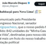 O prefeito de Nova Lima, João Marcelo Dieguez, anunciou em suas redes sociais na noite desta quinta-feira (23) que a cidade será contemplada com 842 unidades de habitação popular do governo Federal, conforme comunicado pelo presidente do Senado, Rodrigo
