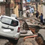 Uma cratera se abriu no meio de uma rua no bairro Morro São Jorge, em Macaé, no Rio deJaneiro, após a chuva intensa que atingiu a cidade nesta segunda-feira (19). Um vídeo feito por moradores mostra que a rua foi dividida ao meio e alguns carros ficaram p ...