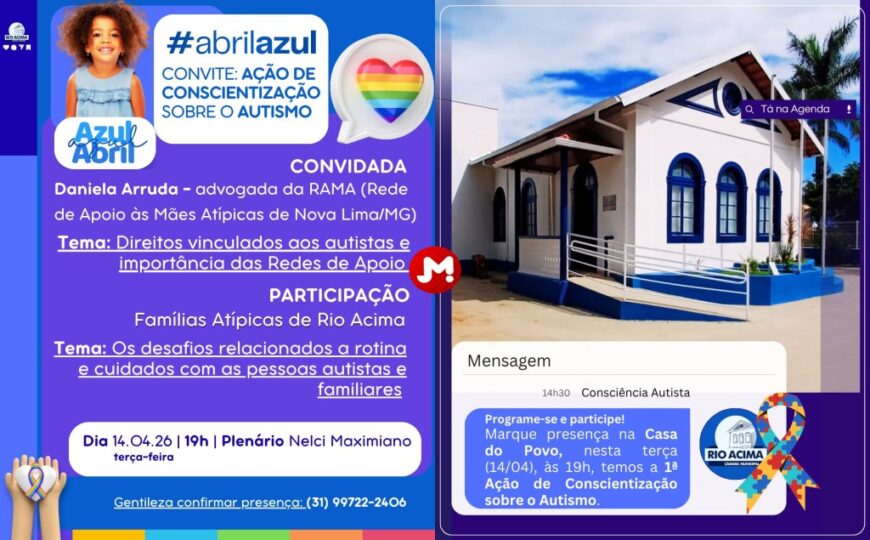 A Câmara Municipal de Rio Acima promove, nesta terça-feira (14), às 19h, a 1ª Ação de Conscientização sobre o Autismo, dentro da campanha Abril Azul.